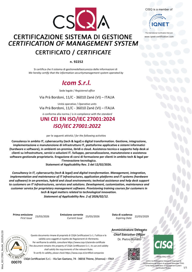 Il nostro impegno verso la sicurezza e l’affidabilità si traduce in un percorso continuo di certificazione secondo gli standard internazionali più riconosciuti. Ogni certificazione ottenuta è la testimonianza concreta della responsabilità con cui operiamo ogni giorno a tutela dei nostri clienti, dei loro dati e della nostra organizzazione.